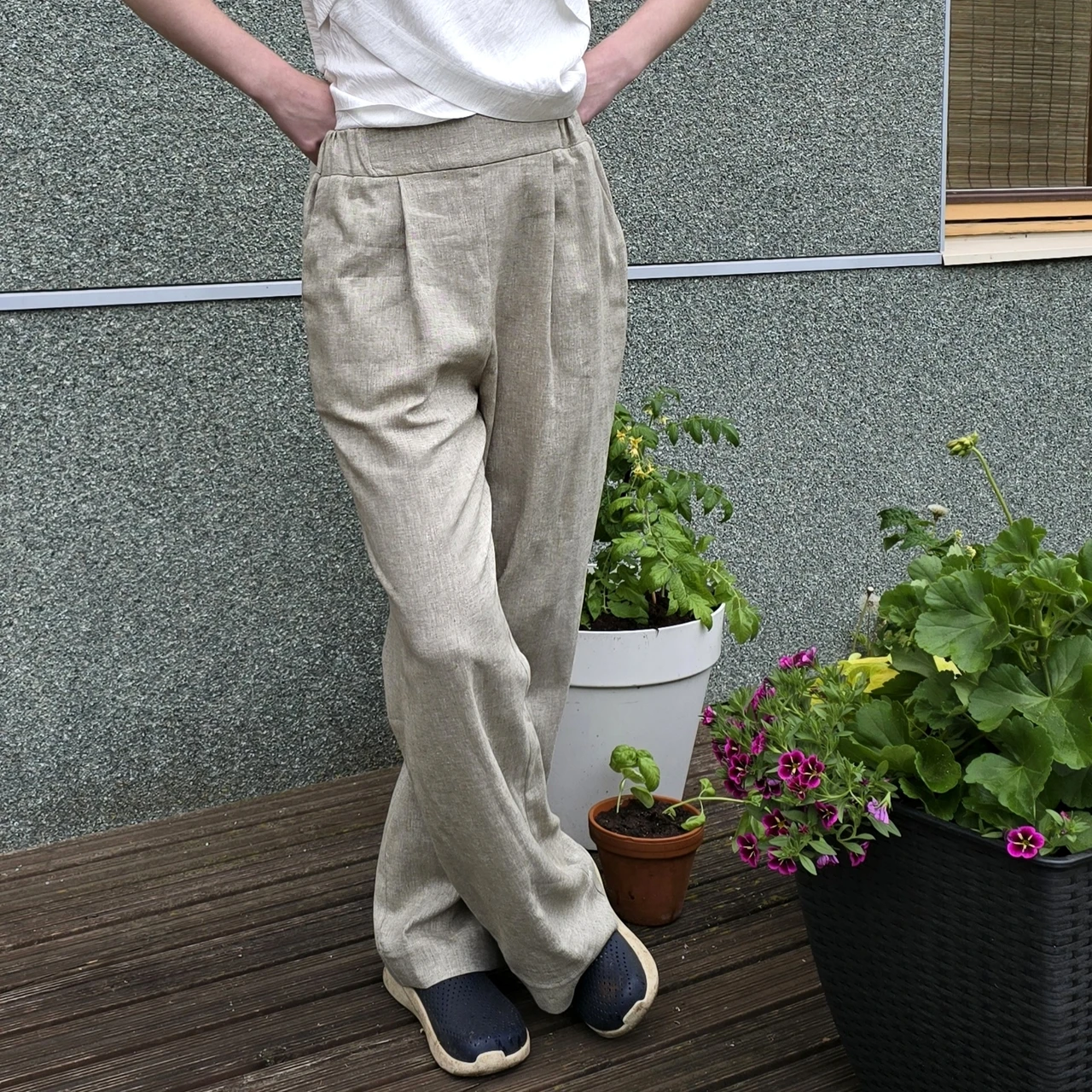 Kahvaturohelisest või sinakast kalasabamustrilisest pehmest linase puuvillasegusest kangast laiad püksid.Taskutega. Esiosal voldid. Kõhul värvel sirgest kangast, külje- ja seljaosal värvlis 5cm laiune kumm.