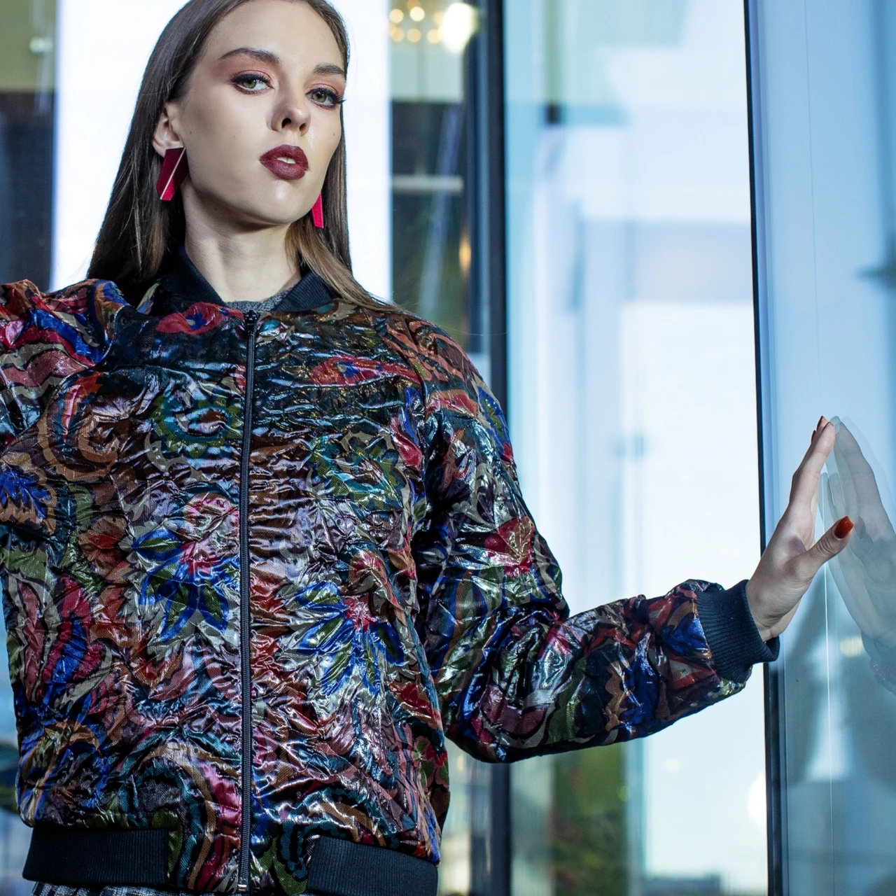 Mustrilisest läikivast kortsulisest kangast bomberjakk. Alläär, krae ja varrukaotsad mustast soonikust. Voodriga. Küljeõmbluses taskud.