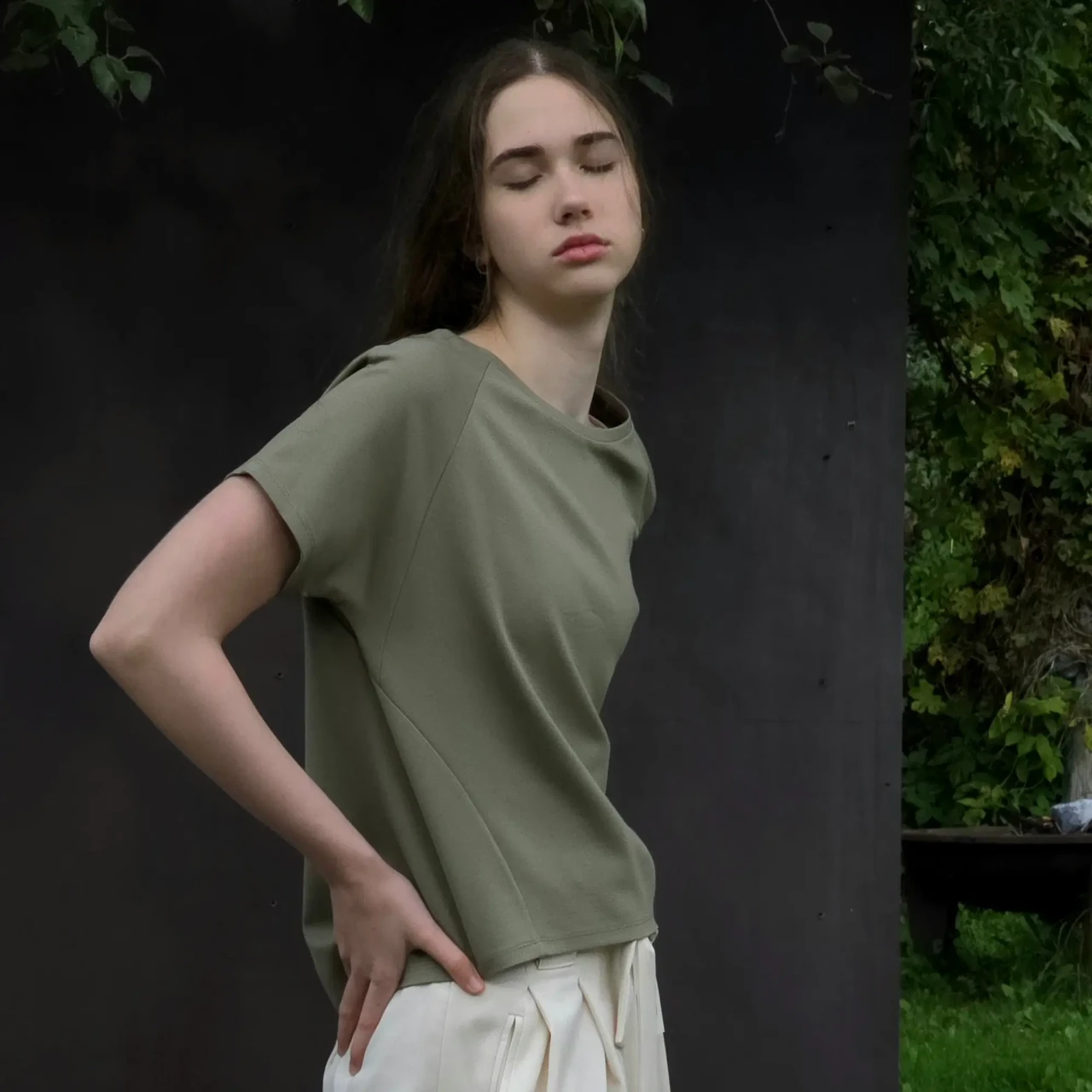 Heavier jersey top in beige with golden print, light green viscose or suede-feel hevier jersey in dark orange or grey. Short raglan sleeves. Diagonal seams. Slightly shorter at the front, with a rather loose silhouette around the bust. Neckline finished with inner binding. Care: machine wash at 30